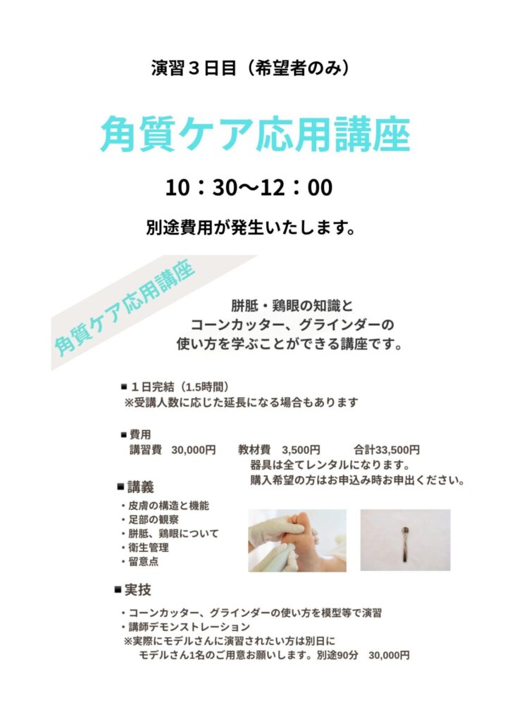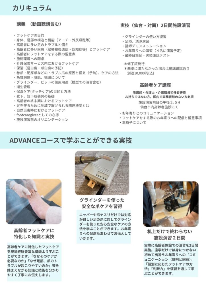 高齢者施設での演習が2日間あるのが特徴です。また巻爪の整え方、グラインダーを使った爪のケア、保湿ケアを学ぶことができます。