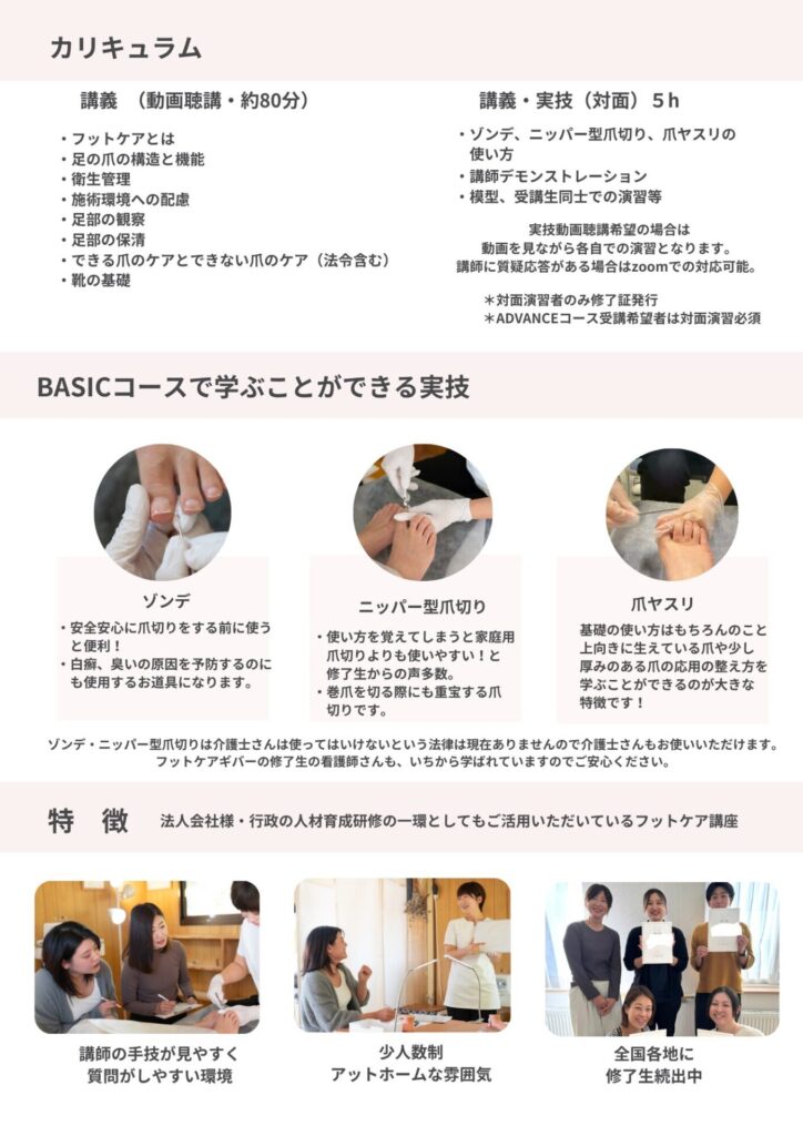 基礎のフットケア、足の爪のケアの方法、靴について講義は動画聴講、演習は対面にて学ぶことができます。(全て動画聴講も可能)
