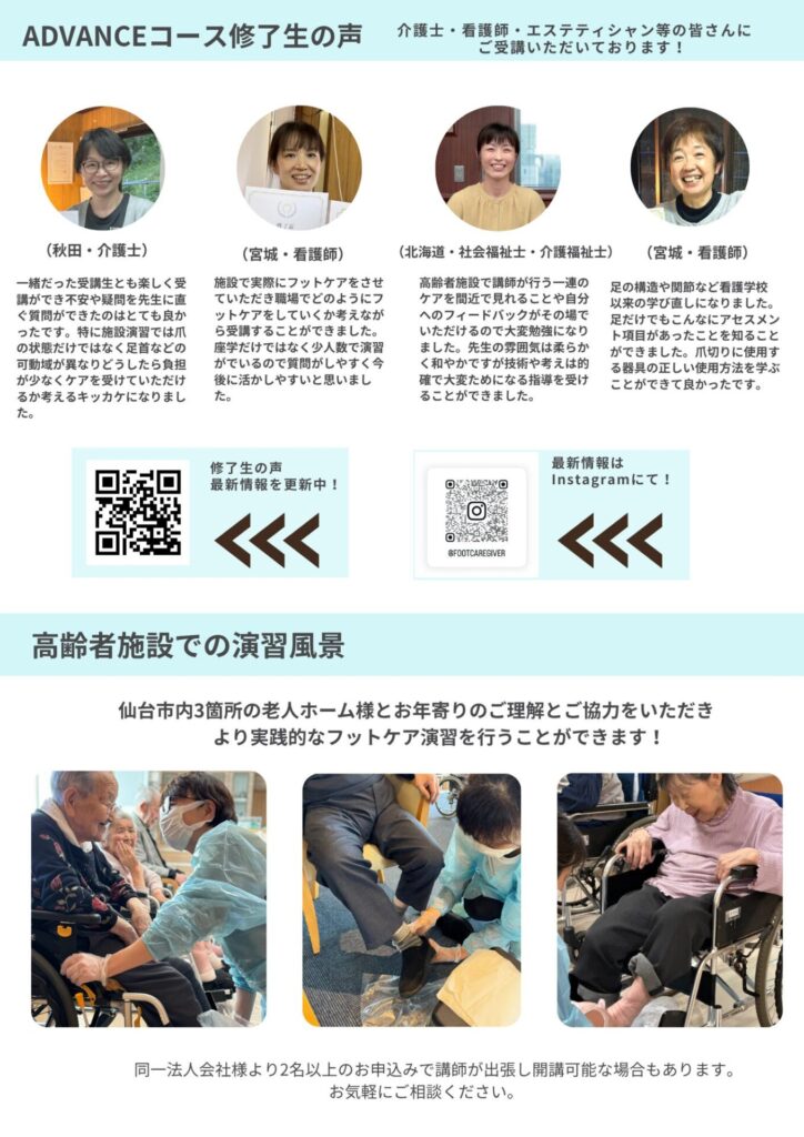 ▫️基礎を固めてから応用の高齢者フットケアを!着実なステップアップ !講義は動画聴講。演習は1日間。これまでフットケアを学んだことのある方は1日で済むように選択肢を広げました。初めてフットケアを学ぶ方でアドバンスコースへステップアップされたい方は2日目の演習もおすすめいたします。仙台、盛岡、東京、福島より上半期はお選びいただくことができます。