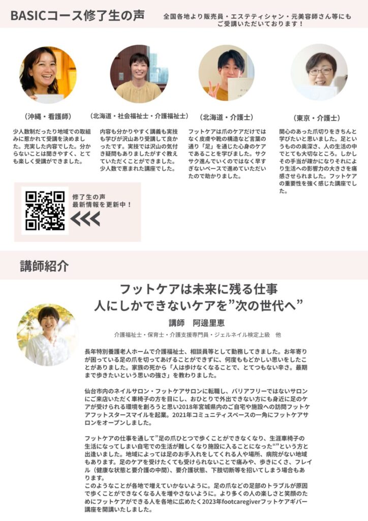 ご家族やご自分の足のケアのために。そして副業、起業等のために学ばれたいという20〜50代中心に人気の講座。開講3年目ですが沖縄・九州・関西・関東・東北・北海道各地より看護師、介護士、販売員さん等にご受講いただいております。