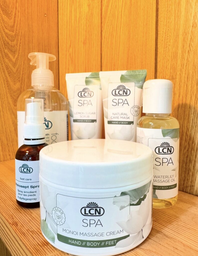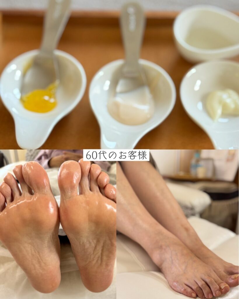 オーガニック製品LCNを使用しております。スクラブにて足部の古い角質を優しく取り除いていきます。柑橘系の優しい香りのするマッサージオイルにて足先〜膝下をほぐします。足先から足首まで高保湿のパックをいたします。パック後のお肌のもちもち感、潤いが好評です。クリームにて血液やリンパの流れを促していきます。自分へのご褒美として。そして毎月の至福の時間としてサロンで足の爪ケアや角質ケアと併用してご利用いただいております人気のメニューです。ホームケア用品もご愛好いただいているお客様も多いのが特徴です。