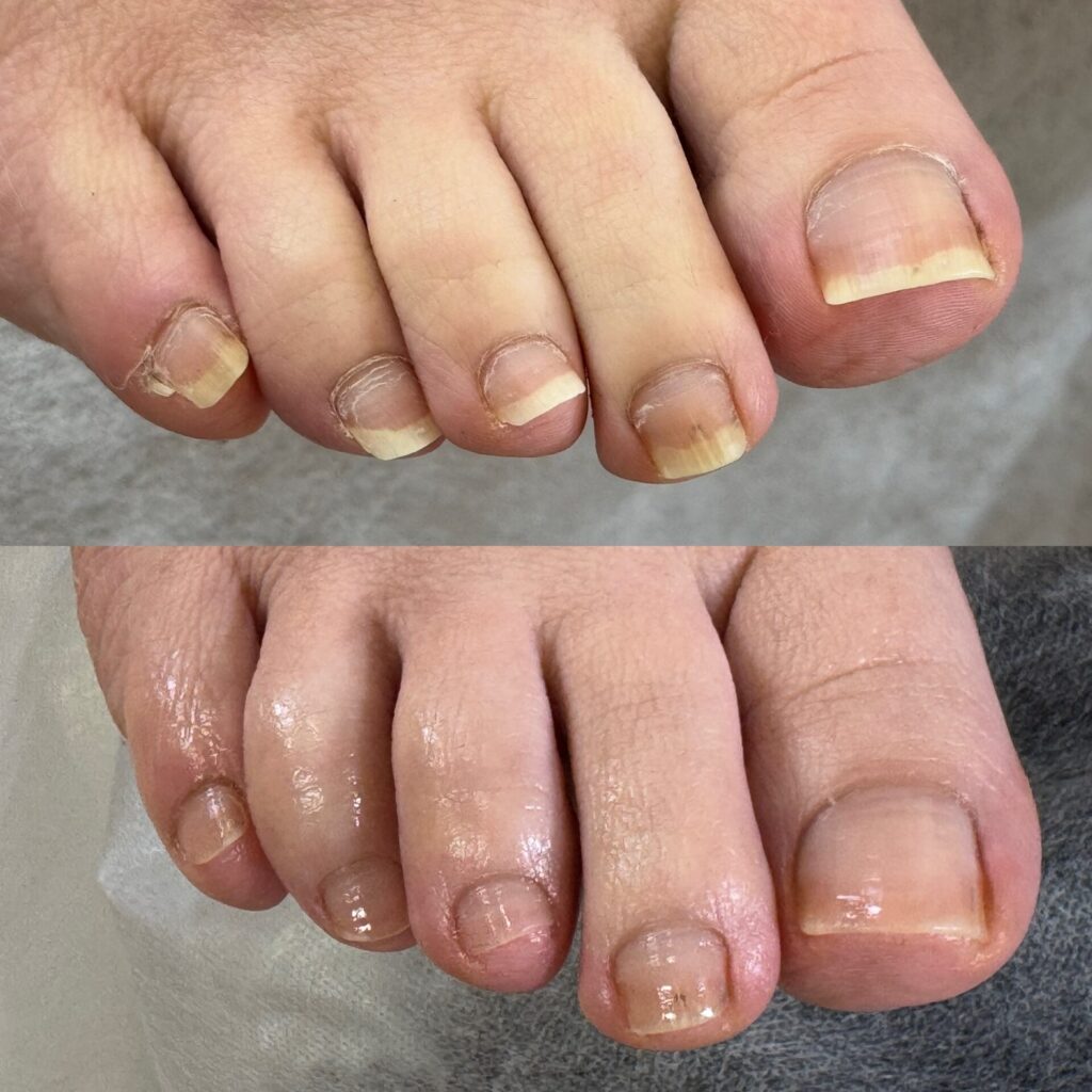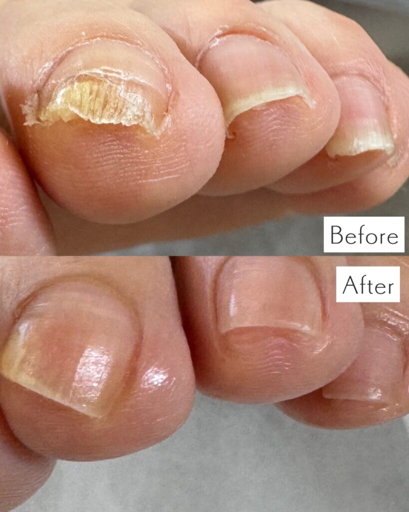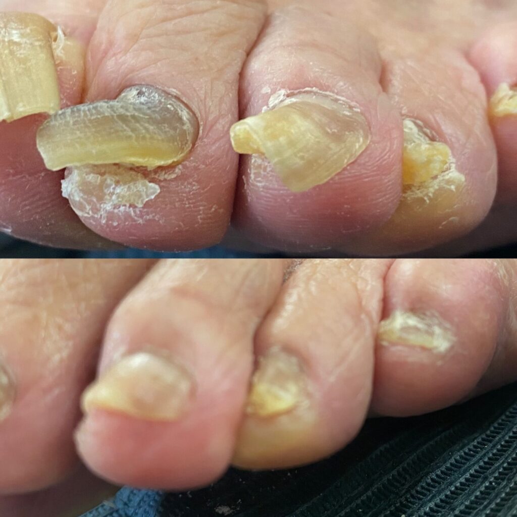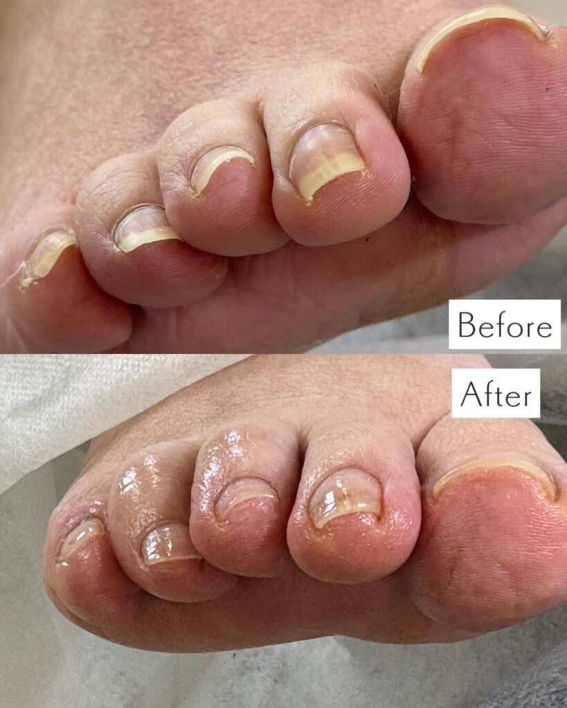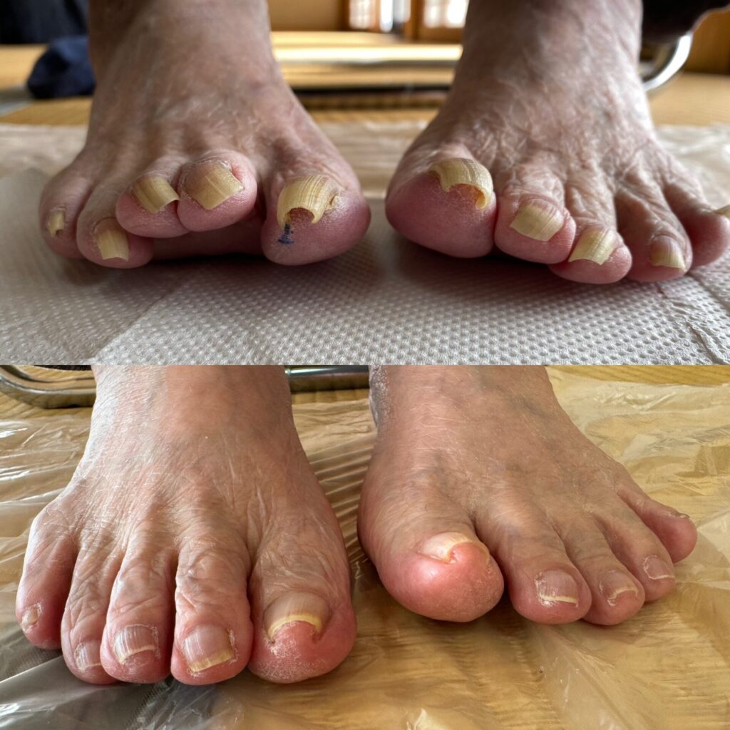 厚みのある爪の原因として合わない靴による足先への圧迫。爪の成長過程で爪の周りの皮膚が隆起してしまうこと。加齢や遺伝等が原因として挙げられます。爪が厚いために家庭用の爪切りで切ることができず伸ばしたままにしておくことで、靴下に爪が引っ掛かり靴下の脱ぎ履きがしにくくなったり、爪が剥がれてしまう恐れもあります。靴に爪があたり痛みを感じる方も中にはいらっしゃいます。より歩きやすい、暮らしやすい身体の土台となるようお爪のケアをさせていただきます。