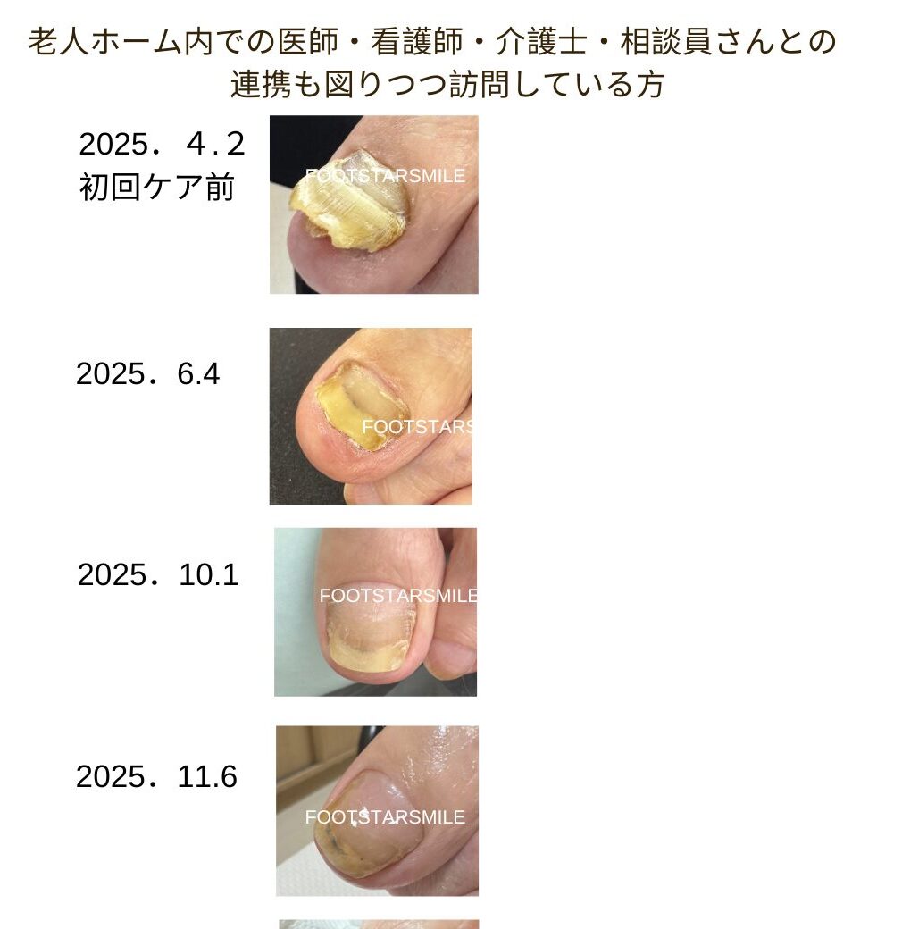フットスタースマイルではカウンセリングにて原因をお客様と共に探り、個々のお客様のお爪に応じた爪のケアを行っていきます。爪の表面の凹凸や段差、厚みはフットケアマシン等を使いながら痛みのないケアをしていきます。当店の人気NO1メニューは老若男女問わず巻爪・肥厚爪のケアになります。