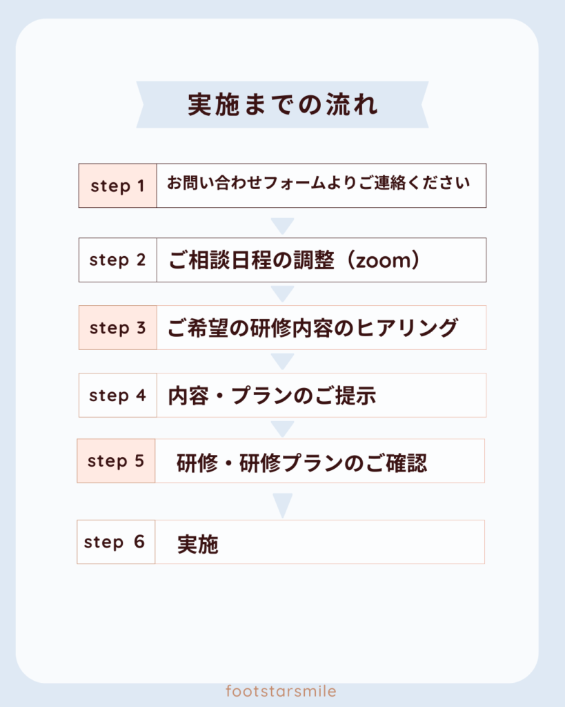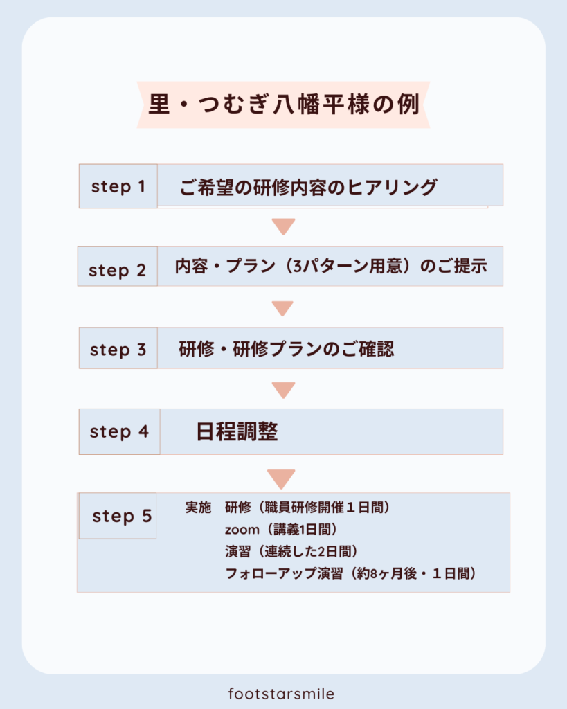 法人会社さま等のニーズやご要望をお伺いし、それに応じた研修・育成プランを作成(無料)。プランをお選びいただき日程等調整の上で講義は基本オンライン、実技は講師が基本的にお伺いし指導をいたします。フットケアギバー講座のみ3名様以上のお申込みで割引が適応となり、修了証も発行されます。