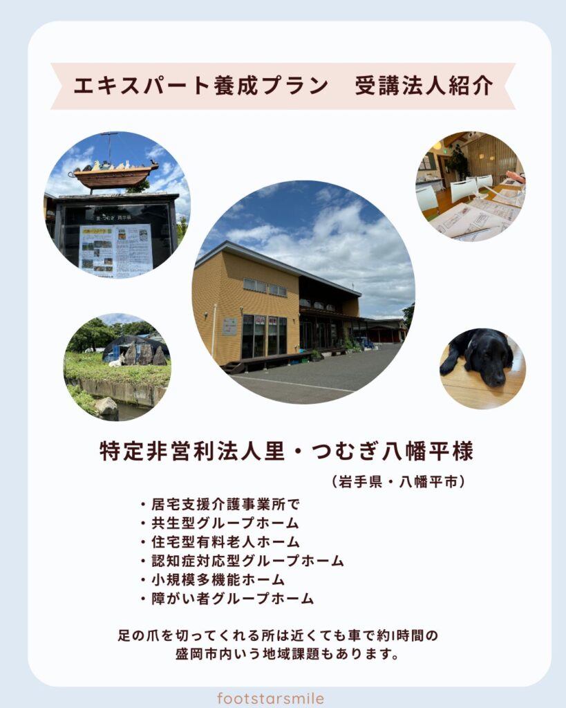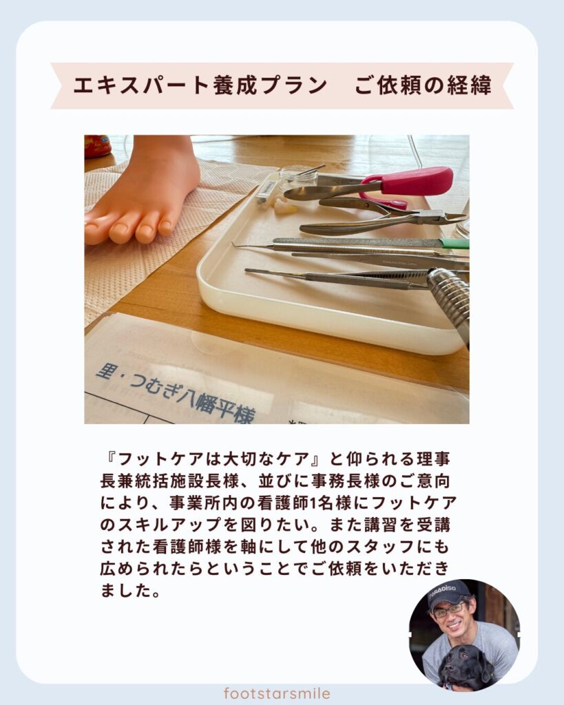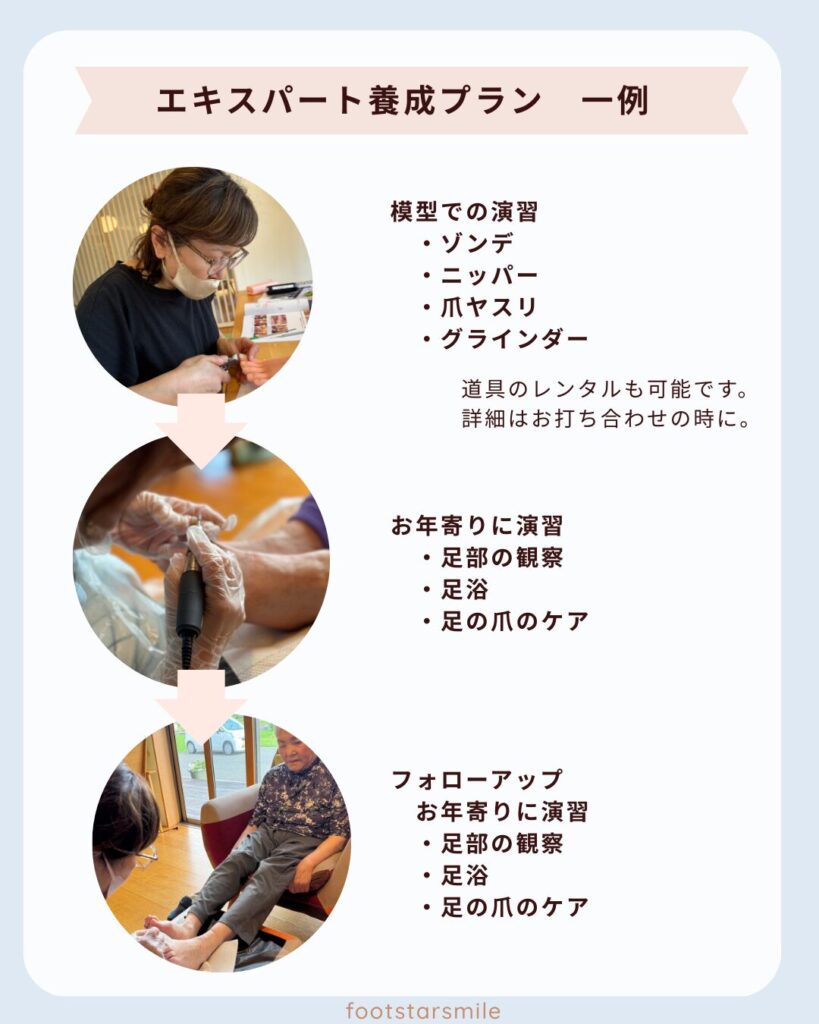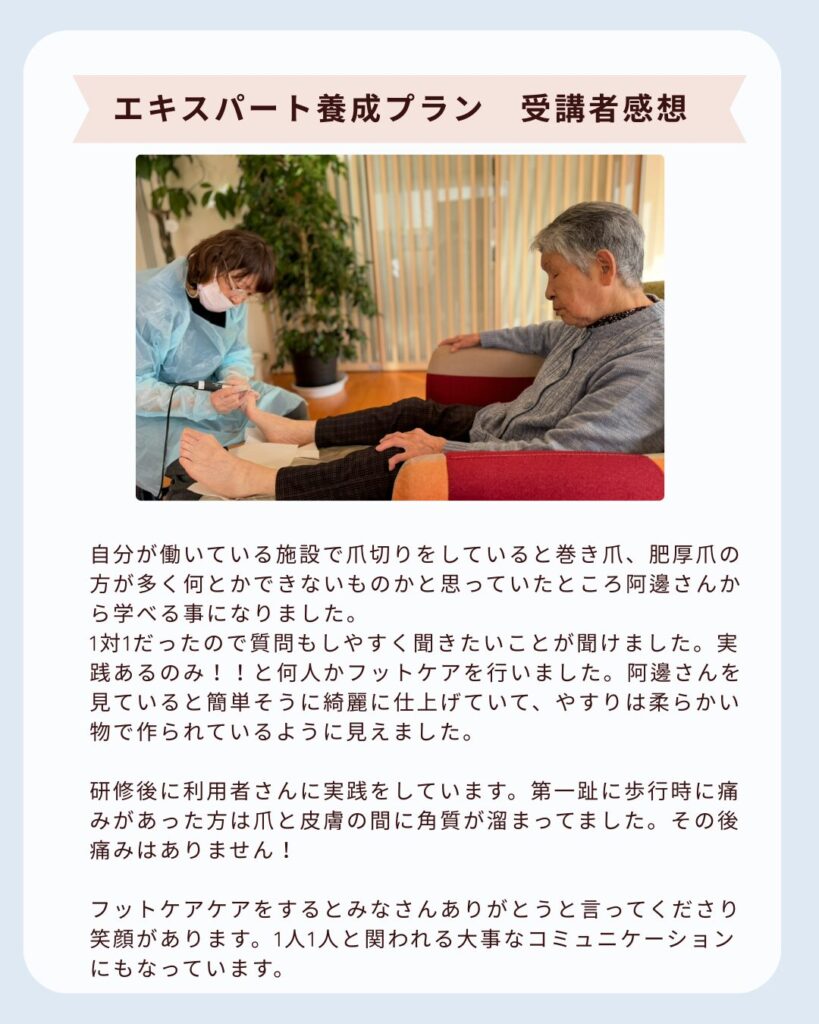 • 高齢者フットケアエキスパート養成(事業所内で他スタッフへの育成指導含む)