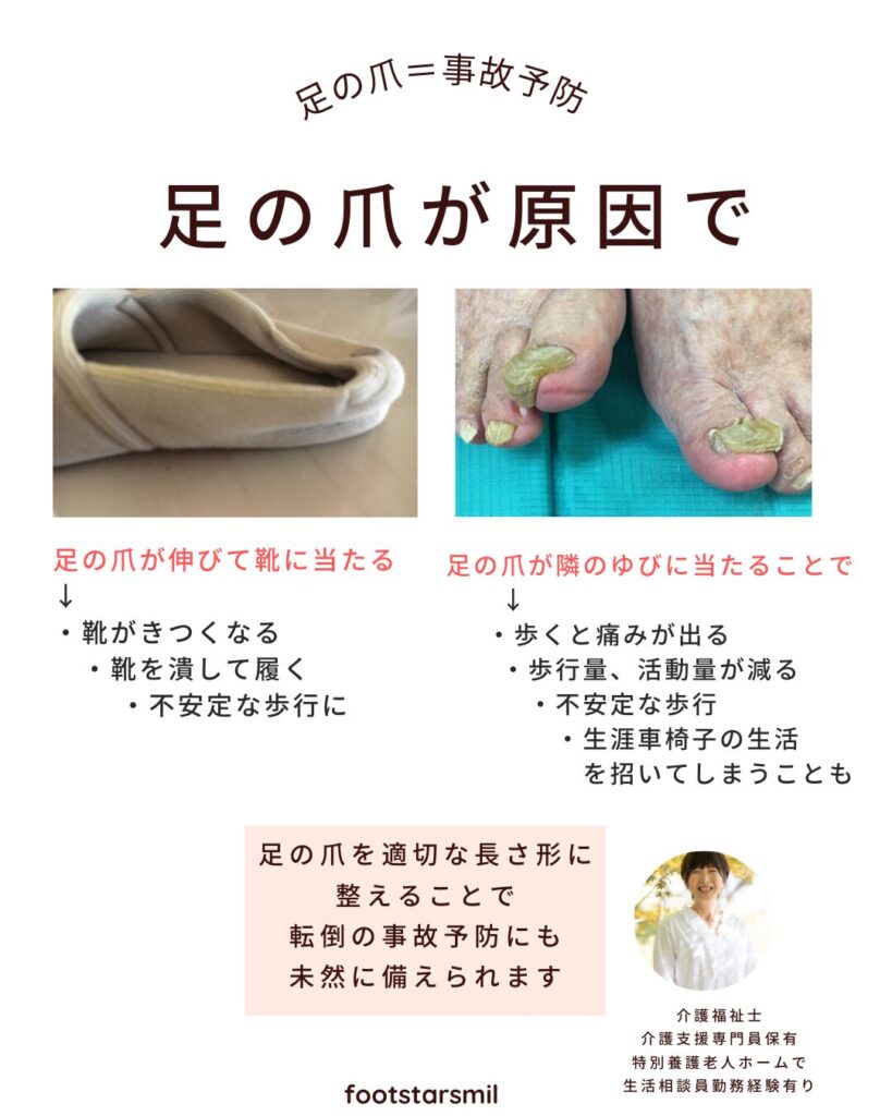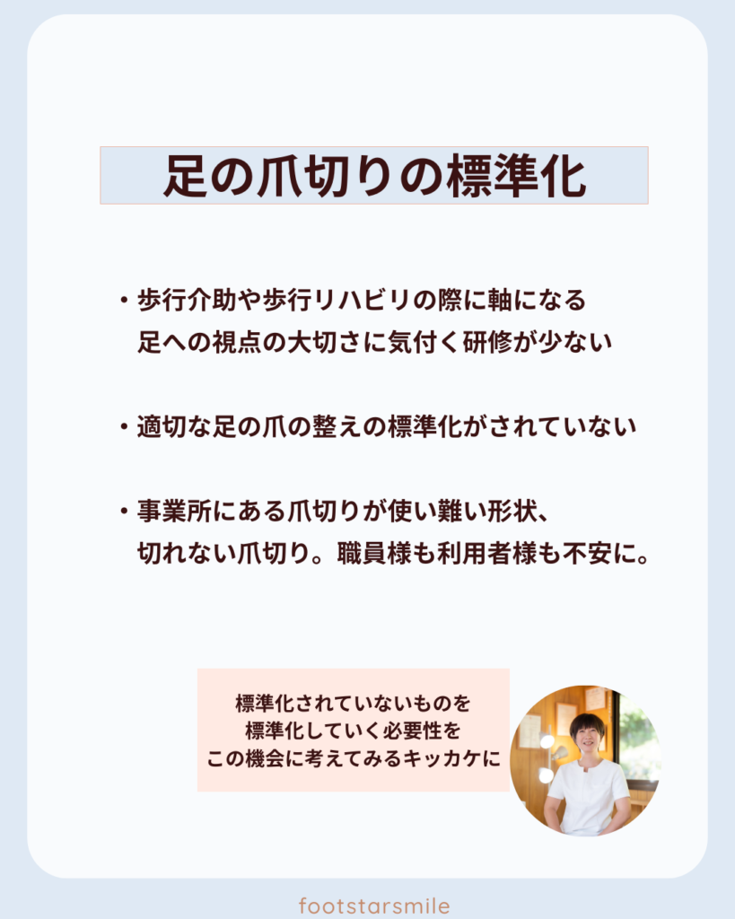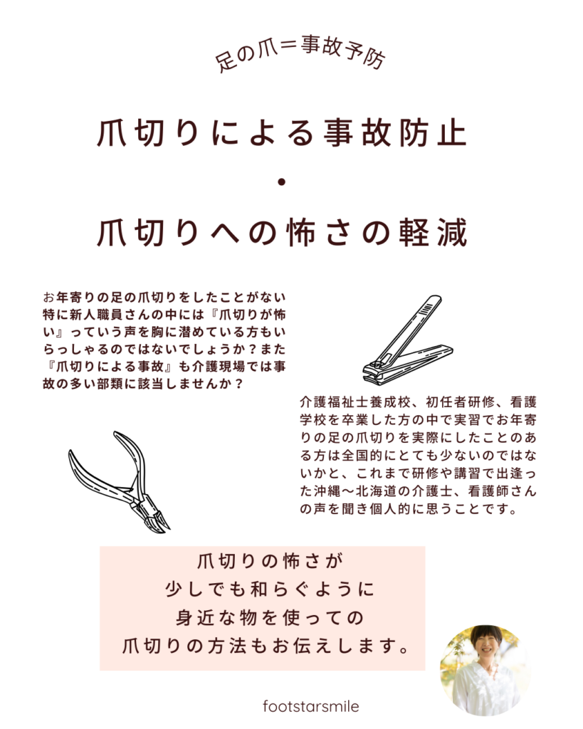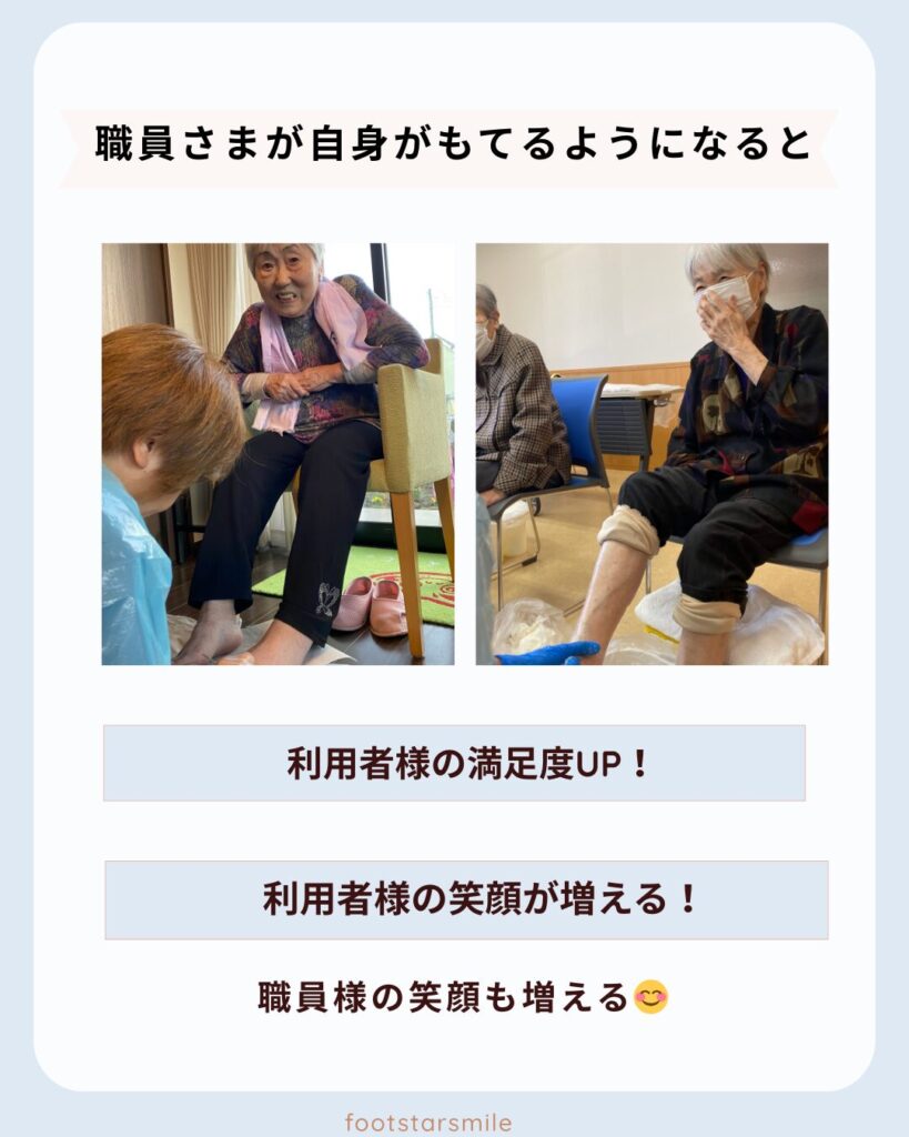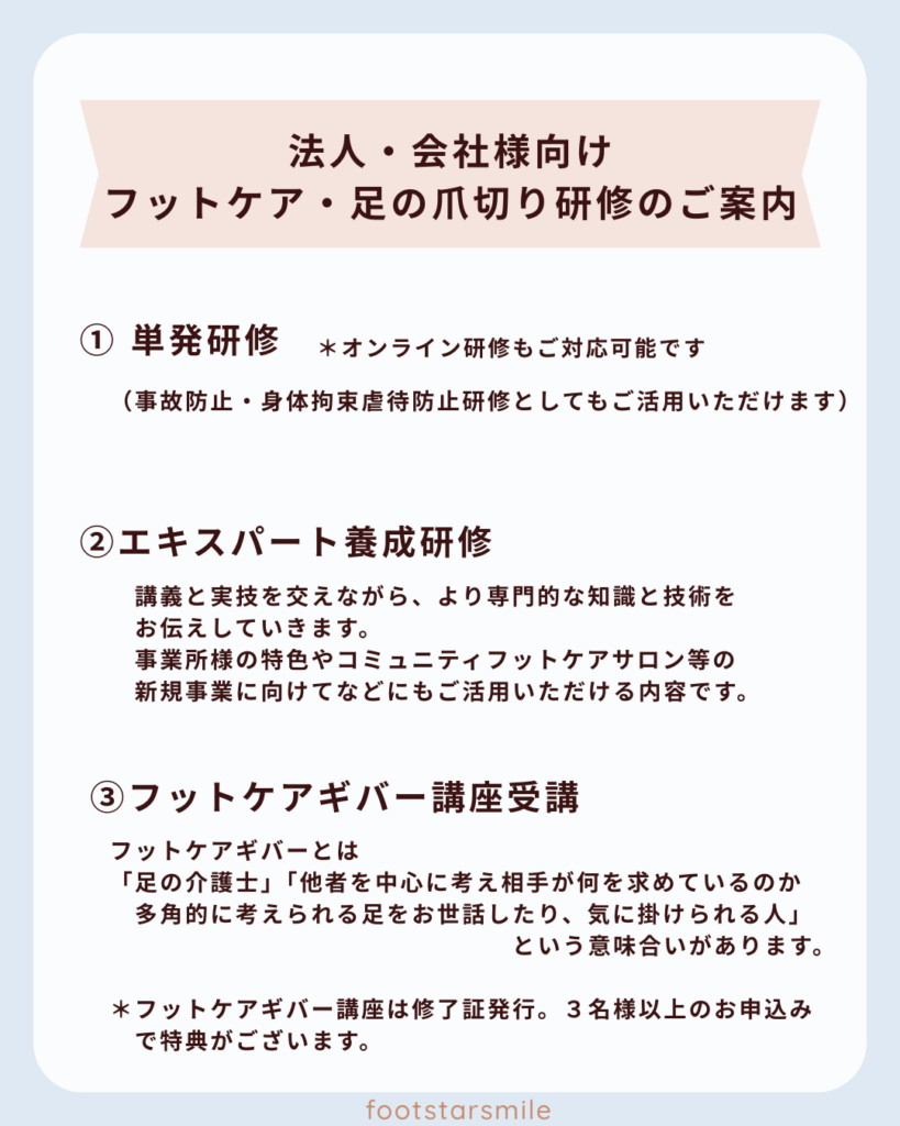 • 利用者様おひとりおひとりへの最適なフットケアの方法の指導