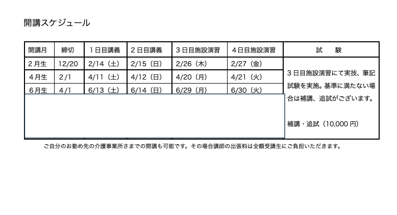 • 実技演習(対面)1日間 *ご自宅や事業所様で動画を見ながらの実技動画聴講コースもお選びいただけます。講師への質疑応答がある場合はzoomにて対応いたします。