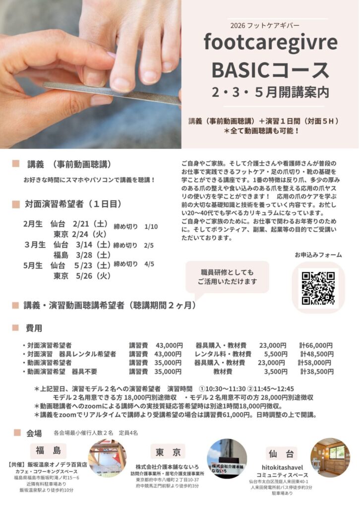 足の爪切りなどのフットケアをスキルアップされたい介護士、看護師さん。ご自身やご家族の足のお手入れを学ばれたい方、副業や開業をされたい方などにご受講いただいているフットケア講座になります。2025年11月現在北海道、青森、秋田、岩手、山形、宮城、福島、群馬、東京、長野、兵庫、愛知、熊本、沖縄よりご受講いただいております。2026年は主に東京、福島県で開講予定。企業、法人様からのご依頼にて随時開講も承っております。